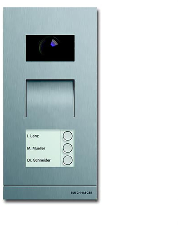 Busch-Welcome® video-buitenpost 3 beldrukkers, videocamera met automatische dag-/nachtomschakeling en infrarood-leds voor verlichting bij nachtopnames, voor inbouwmontage met 83402 U-681/-689 of opbouwmontage met 83402 AP-681/-689, IP44, rvs. |