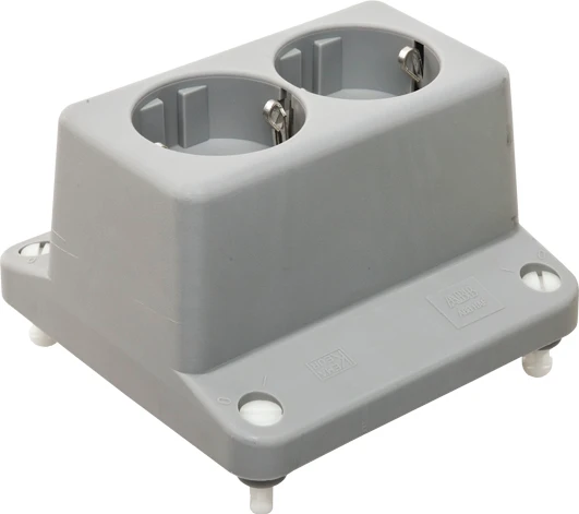 Grijs deksel voor de kabeldoos 3640 met geïntegreerde dubbele wandcontactdoos met beschermingscontact. |