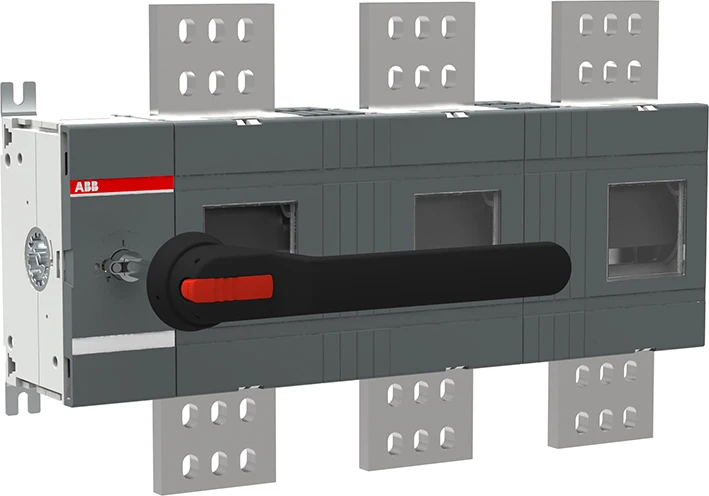 3-polige, frontbediende, bodemmontage werkschakelaar met zwarte IP65-hendel en as, brede faseafstand, aansluitboutenset inbegrepen