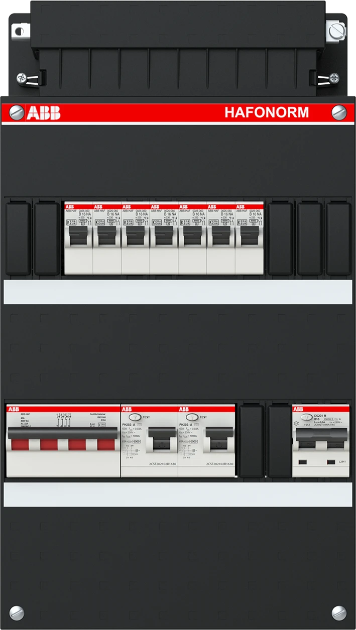 Groepenkast, geassembleerd Hafonorm 3-fase, 1 HS 40A 4P 2 ALS 63A 2P 30mA, 7 1 aardlek aut. B16 1P+N 300 mA