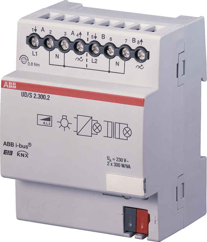 KNX universele dimactor, 2-voudig, 230 V AC, 300 VA, DIN-rail.