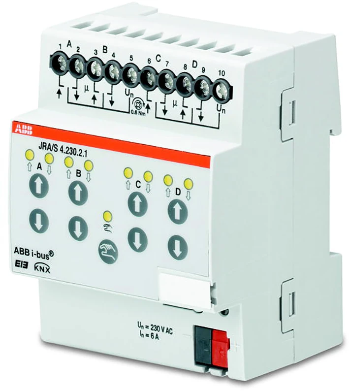 KNX jaloezie-/rolluikaktor, 4-voudig, met handbediening, 230 V AC, 6 A, DIN-rail. |