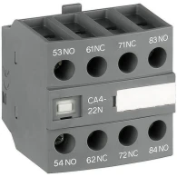 CA4-22N is een 4-polig, frontgemonteerd hulpcontactblok met schroefklemmen. De CA4-..N-versie biedt een klemmenindeling die overeenkomt met de markering van 4-polige NF(C)(Z)(B)-contactorrelais. CA4-22N is leverbaar met 2 N.O.- en 2 N.C.-direct werkende contacten voor standaard industriële omgevingen.