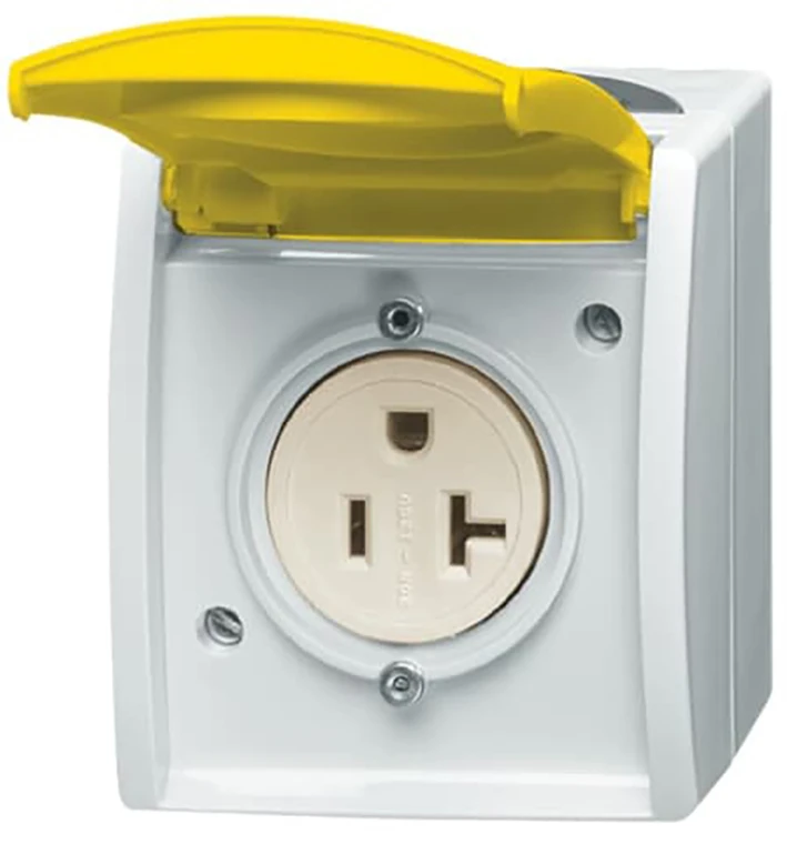 Opbouw Busch-Nema- wandcontactdoos, met gele klapdeksel, met 57,8 x 9,8 mm tekstveld, 20 A/125 V, IP44, ocean. |
