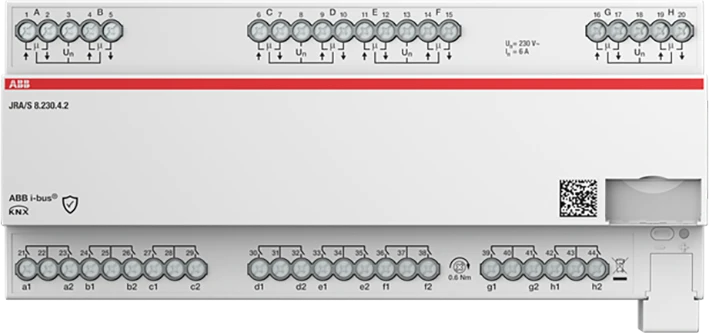 KNX jaloezie-/rolluikaktor, 8-voudig, met 8 binaire ingangenmet bewegingstijdbepaling en handbediening, 230 V AC, 6 A, DIN-rail, KNX Data Secure. |