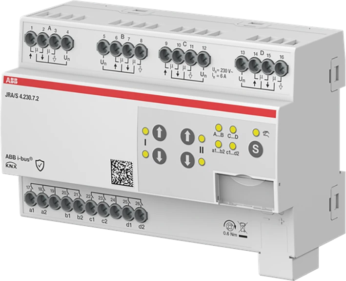 KNX jaloezie-/rolluikaktor, 4-voudig, met 4 binaire ingangen,met bewegingstijdbepaling en handbediening, 230 V AC, 6 A, DIN-rail, KNX Data Secure. |