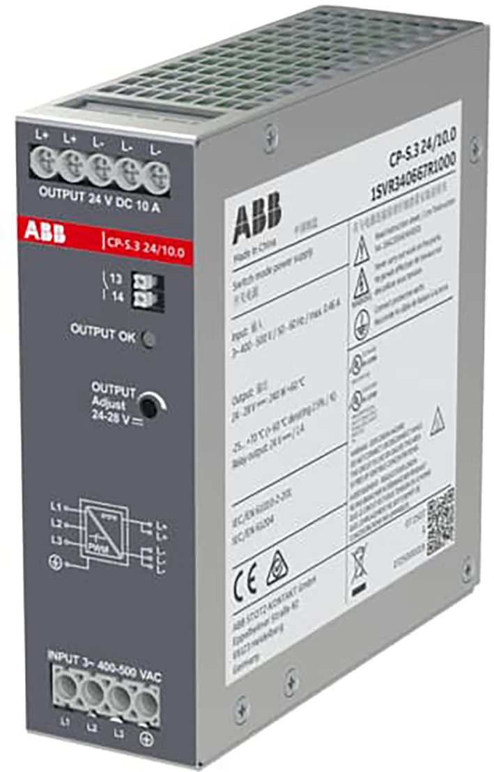 De CP-S.3 24/10.0 is een voeding uit de nieuwe generatie CP-S.3-serie. De primaire schakelende voeding biedt een breed ingangsbereik van 3 ~ 320 ... 575 V AC; de genormeerde ingangsspanning is 3 ~ 400 ... 500 V AC. Het nominale uitgangsvermogen is 240 W, de nominale uitgangsstroom is 10 A bij een uitgangsspanning van 24 V DC. De uitgangsspanning is instelbaar binnen 24 tot 28 V DC. De voeding biedt een U/I-uitgangskarakteristiek met een vermogensreserve tot 150% gedurende 5 s en maakt parallelbedrijf mogelijk om de capaciteit te vergroten en redundantie te realiseren. Verdere kenmerken: vermogensfactorcorrectie volgens EN 61000-3-2. Redundantie-eenheid en buffermodules zijn als accessoires beschikbaar.