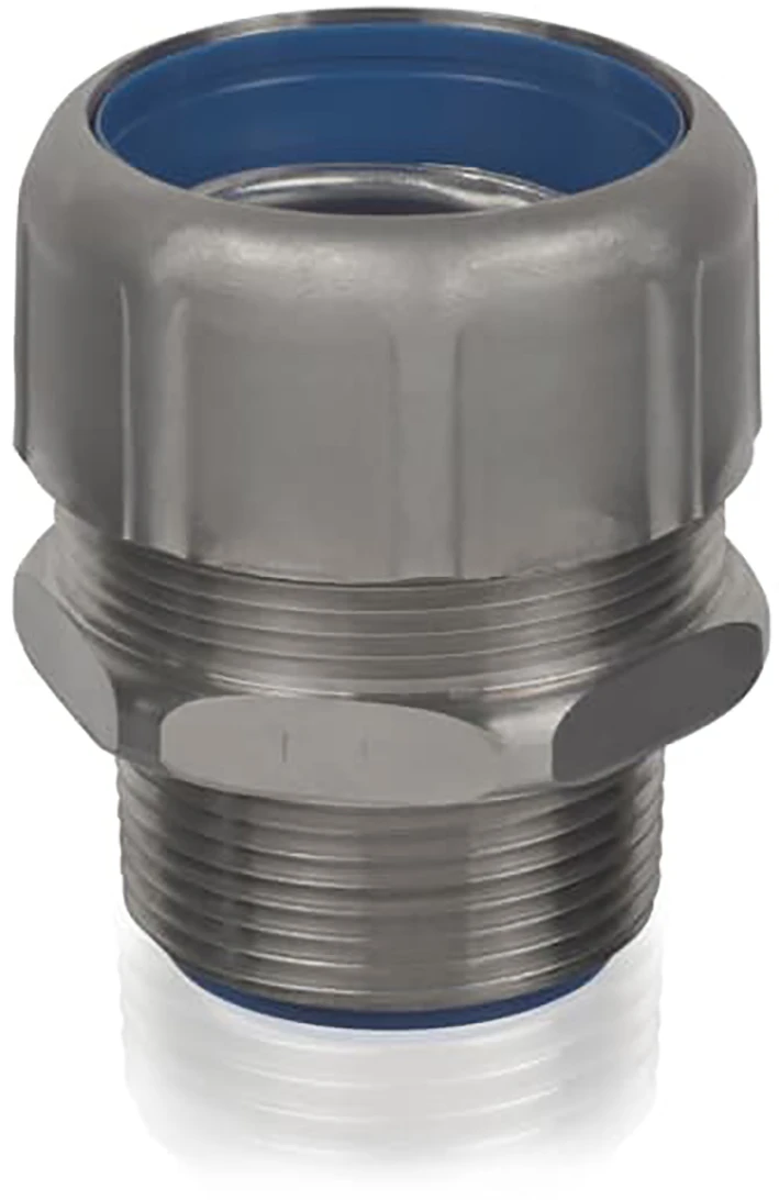 1/2 inch vloeistofdichte fitting voor flexibele metalen leiding, recht, UL/CSA Listed, hoge UV-bestendigheid, NEMA-classificaties: 3, 3R, 4, 4X, lengte 1,74 inch/44,20 mm, breedte 1,33 inch/33,78 mm, temperatuurbereik 0 tot 105 °C, 316 roestvast staal met Duraplated-aardkegel. |