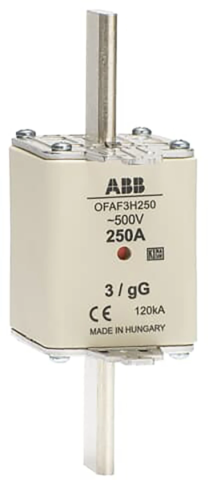 Zekering, nominale stroom 315 A, maat NH3, nominale spanning 500 VAC / 250 VDC, gebruikscategorie gG, nominale afschakelcapaciteit 120 kA (AC) / 80 kA (DC) |