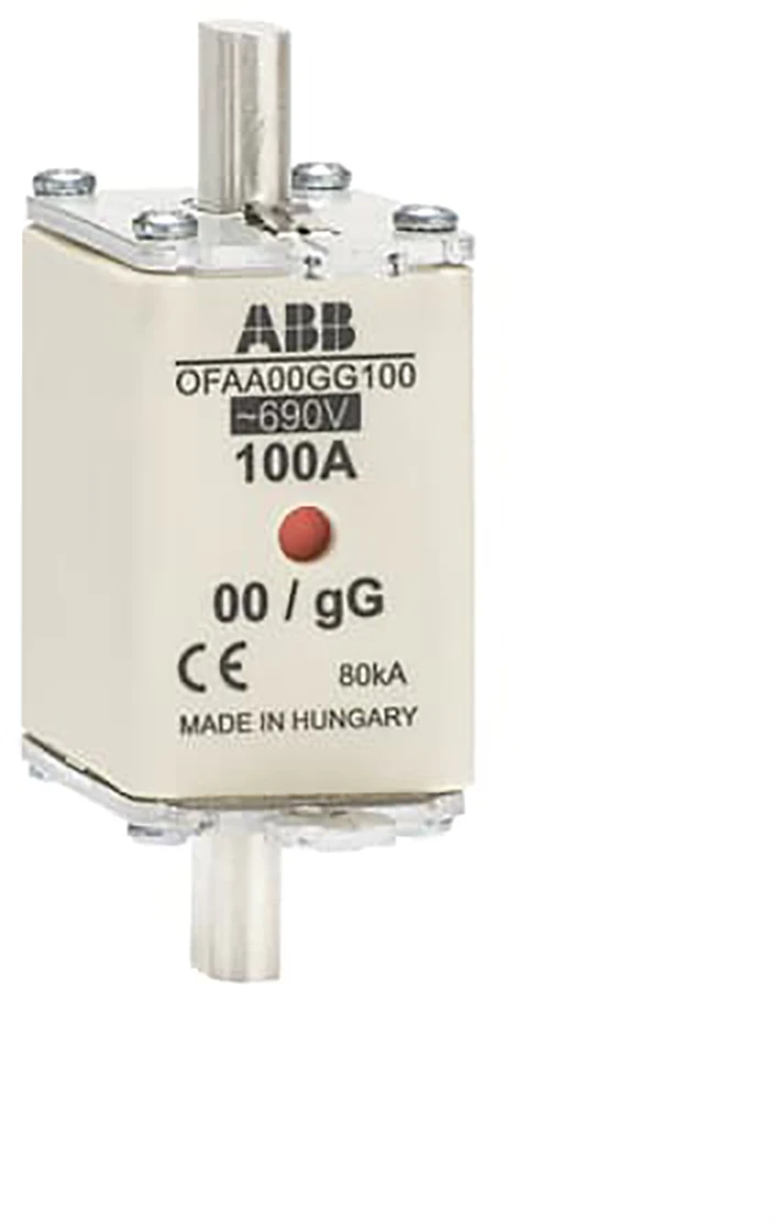 Zekering, nominale stroom 100 A, maat NH00, nominale spanning 690 V AC / 250 V DC, gebruikscategorie gG, afschakelvermogen 80 kA (AC) / 80 kA (DC) |