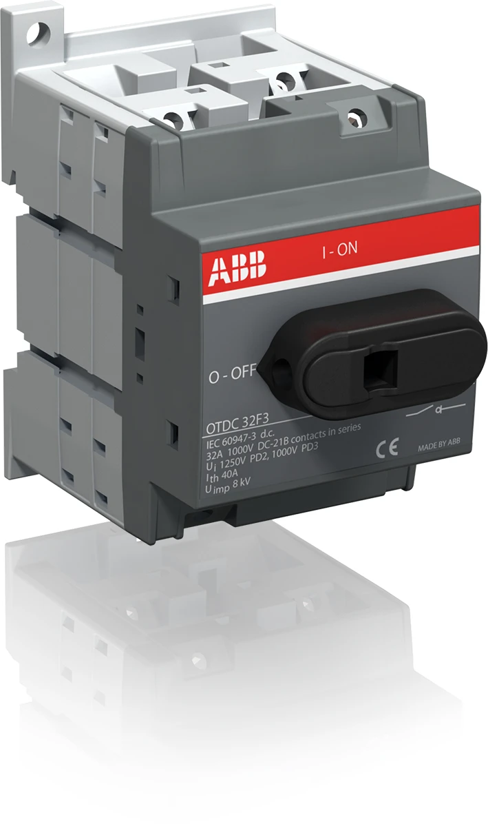 OTDC32F3 DC lastscheider, Aansluitboutenkit meegeleverd, Hendel en as apart te bestellen, Bodemmontage, IEC 1000 VDC 32 A enkelvoudig circuit