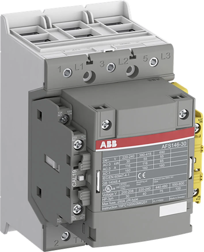 De AFS146-30-12-13 is een 3-polige contactor – 1000 V IEC of 600 V UL – met voorgemonteerde zijdelings gemonteerde hulpcontactblokken met dubbele klemverbindingen: 1 links (1 N.O + 1 N.C.) en vast 1 rechts (1 N.C.). Hij stuurt motoren tot 75 kW / 400 V AC (AC-3) of 100 hp / 480 V UL en schakelt stroomkringen tot 225 A (AC-1) of 200 A UL general use. AFS-contactoren kunnen eenvoudig worden geïntegreerd in systemen van machinebouwers die voldoen aan de belangrijkste normen EN ISO 13849 en EN 62061 – wat het veilige gebruik van uw machines en apparatuur waarborgt. Een gemakkelijk herkenbaar geel low-energy hulpcontactblok zorgt voor de statusfeedbackcircuits die vereist zijn in machineveiligheidstoepassingen. Dankzij de AF-technologie heeft de contactor een breed stuurspanningsbereik (100–250 V, 50/60 Hz en DC), beheert grote variaties in stuurspanning, verlaagt het energieverbruik in de schakelkast en zorgt voor een betrouwbare werking in instabiele netten. Bovendien is overspanningsbeveiliging ingebouwd, wat een compacte oplossing biedt. AF-contactoren hebben een bloktype ontwerp, kunnen eenvoudig worden uitgebreid met aangebouwde hulpcontactblokken en een brede reeks accessoires. |