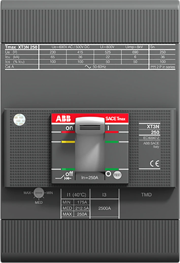 Vermogensautomaat TMAX XT3S 250, vaste driepolige uitvoering met frontaansluitingen en thermomagnetische beveiliging TMD R 125-1250 A |