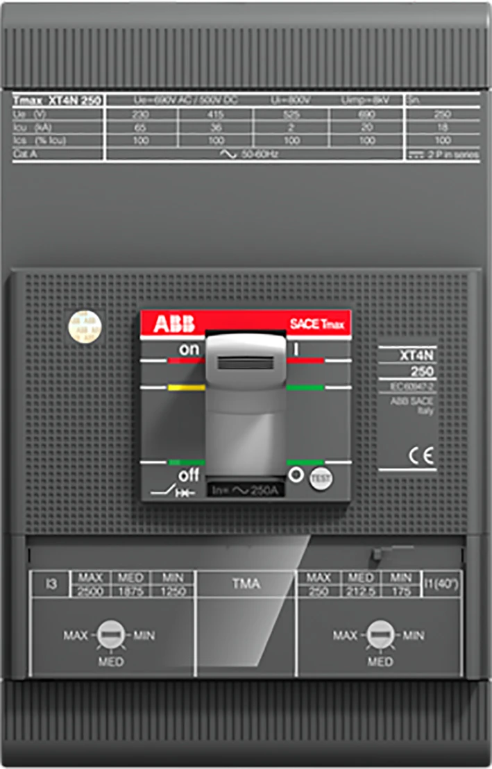 Vermogensautomaat TMAX XT4H 160, vaste uitvoering, driepolig, met frontaansluitingen en magnetische beveiliging MA, Iu 100 A, I3=500...1000 A |
