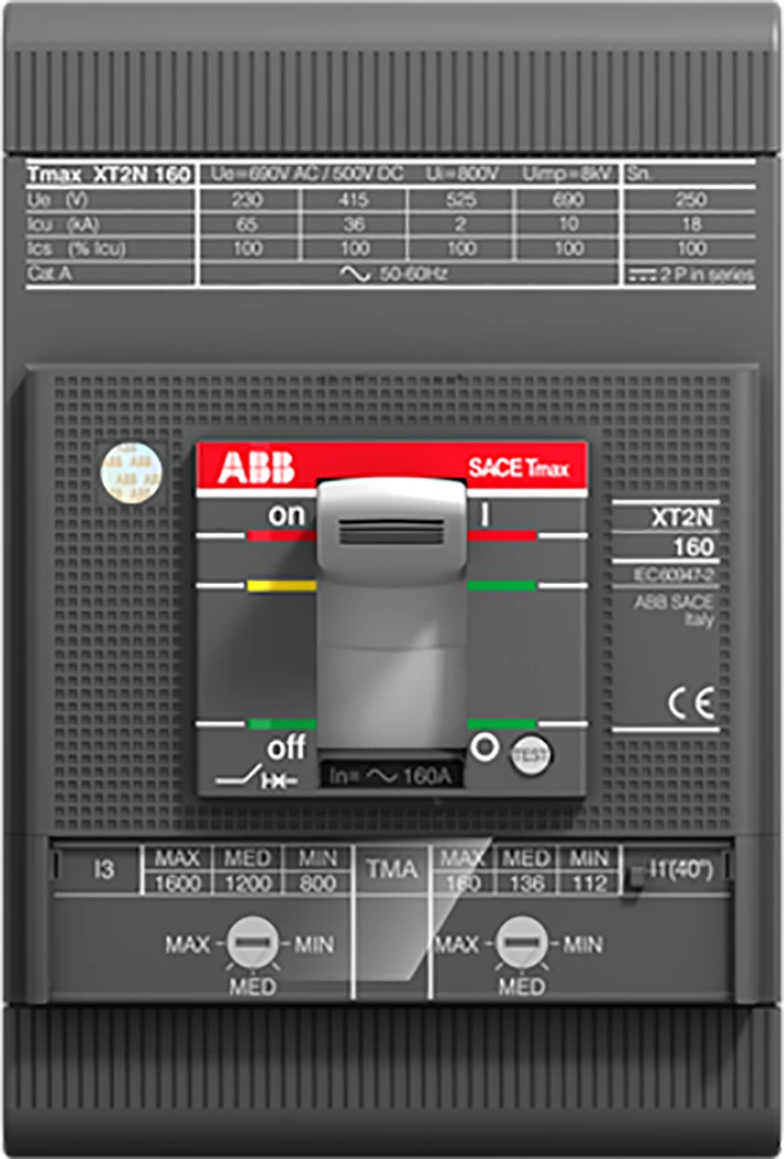 Vermogensautomaat TMAX XT2L 160, vaste uitvoering, driepolig, met frontaansluitingen en thermomagnetische beveiliging TMD R 12,5–125 A |
