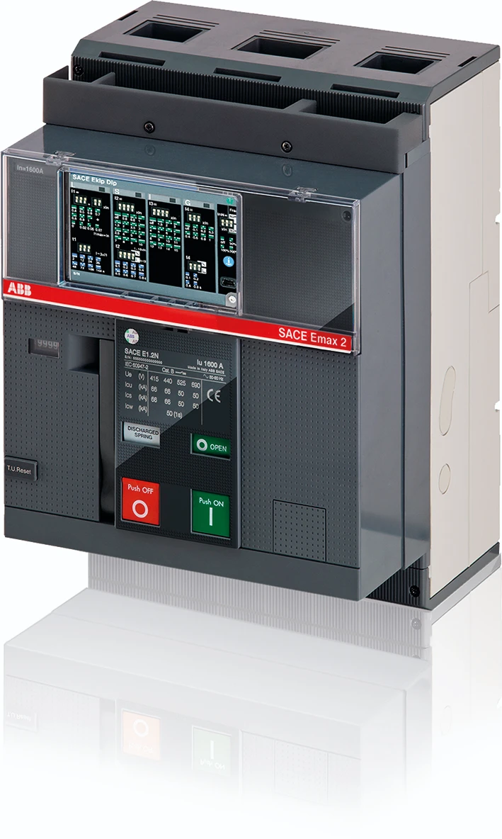 Vermogensautomaat SACE EMAX2 E1.2N 1250, vast, driepolig, met frontaansluitingen en electronische beveiliging in AC Ekip/DIP-LI R 1250, uitgerust met: 4 hulpcontacten en vermogensautomaat in positie open-gesloten. |