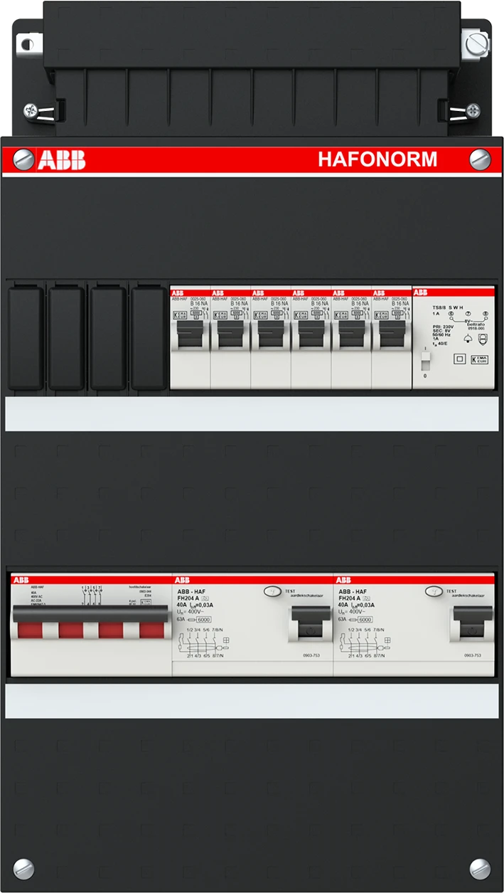 Groepenkast, geassembleerd Hafonorm 6x achter 2x 30mA + T + HS, 3-f Installatiekast