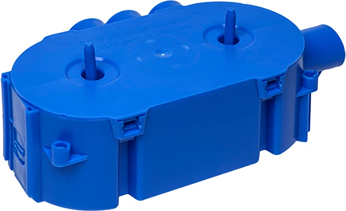 Dubbele inbouwdoos voor gietbouw. Vier buisinvoeren met buisvergrendeling d.m.v. klemveren. Met haken en ogen voor het vastbinden met draad op het wapeningsnet. De pennen hebben hetzelfde boorpatroon op de tunnel als twee gekoppelde MGD50 dozen. |
