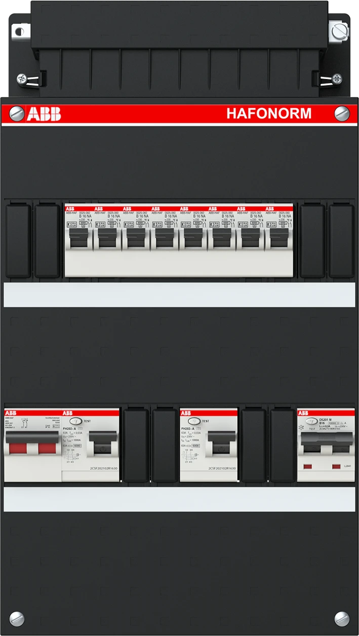Groepenkast, geassembleerd Hafonorm 1-fase, 1 HS 40A 2P 2 ALS 63A 2P 30mA, 8 MCB B16 1 aardlek aut. B16 1P+N 300 mA