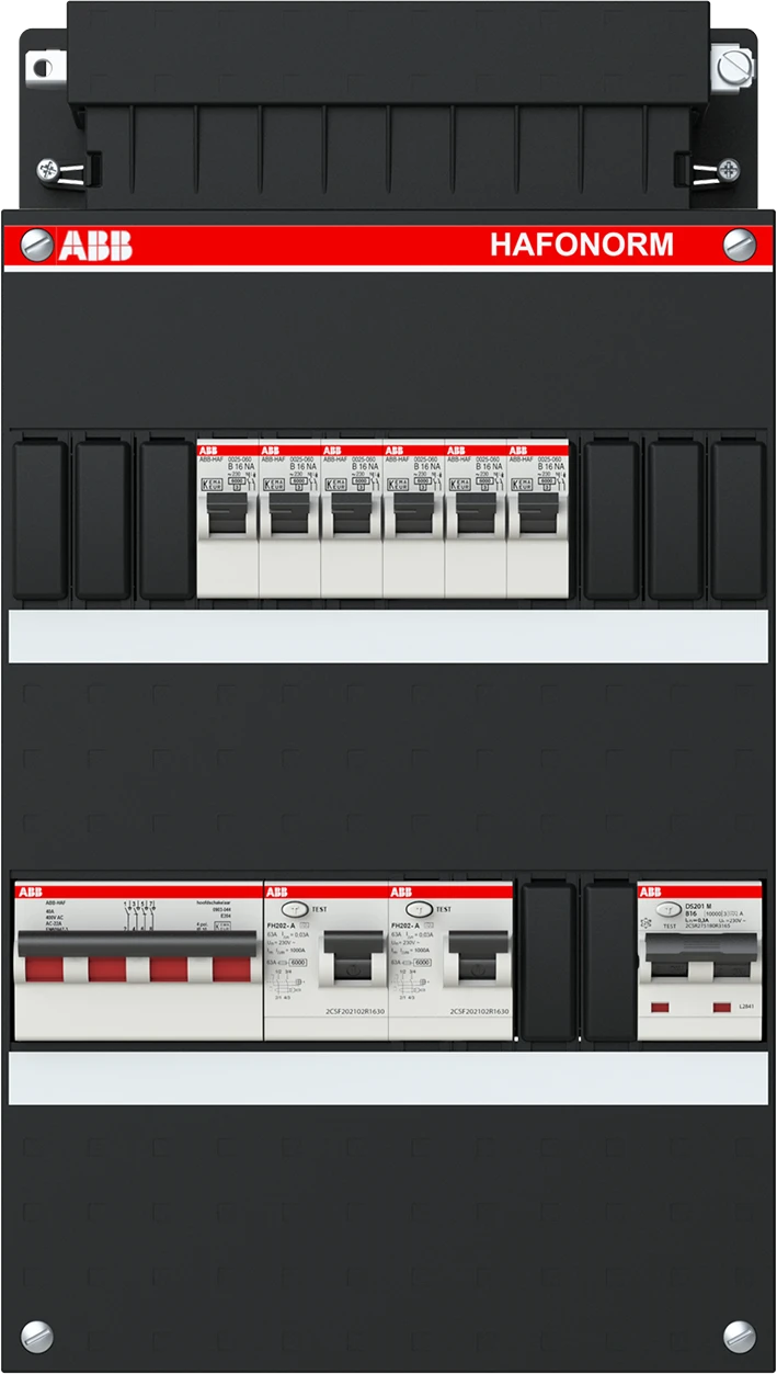 Groepenkast, geassembleerd Hafonorm 3-fase, 1 HS 40A 4P 2 ALS 63A 2P 30mA, 6 MCB B16 1 aardlek aut. B16 1P+N 300 mA