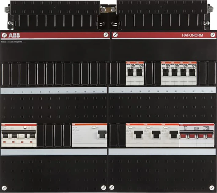 Groepenkast, geassembleerd Hafonorm 3-fase, 1 HS 40A 4P, 1 ALS 63A 4P 30mA 3 ALS 63A 2P 30mA, 6 MCB B16 1 aardlek aut. B20 3P+N 300 mA 1 aardlek aut. C16 3P+N 30 mA