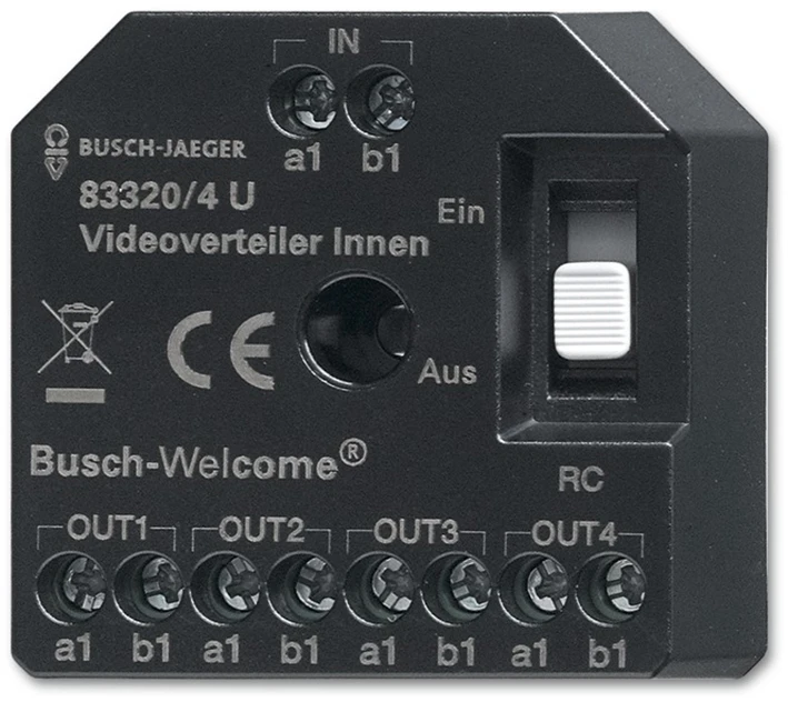Busch-Welcome® video-verdeler-binnen, voor de verdeling van het videosignaal bij leidingsvertakkingen (bijvoorbeeld in een stijgleiding), 4 uitgangen, inbouwdoosmontage.