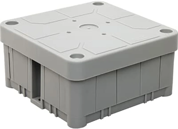 Kabeldoos, zeven uitbreekpoorten en drie invoerstukken voor 16 mm buis en kabel tot 14,5 mm. Inclusief een blind inzetstuk. Grijze deksel is voorzien van snelsluiting. Met centrale bevestigingsschroef voor montage op kabelgoot. Drie kabelgeleiders. |