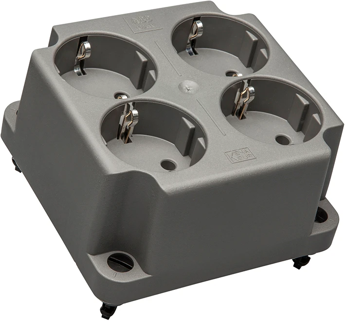 Grijs deksel voor de kabeldoos 3640, van gerecycled materiaal, met geïntegreerde viervoudige wandcontactdoos met beschermingscontact per twee geschakeld. |
