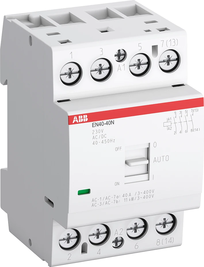 De EN40..N-installatiecontactoren worden gebruikt voor het schakelen van enkel- en driefasige belastingen tot 40 A en kunnen worden bediend met AC of DC en/of handmatig. Deze contactoren zijn geschikt voor zowel huishoudelijke toepassingen als industriële omgevingen. De volgende voordelen worden geboden: Bromvrije werking, laag energieverbruik, geïntegreerde overspanningsbeveiliging en handmatige override. Er zijn diverse contactcombinaties en accessoires beschikbaar. Handmatige bediening is beschikbaar in 3 standen: "On", "Off", "Auto". |