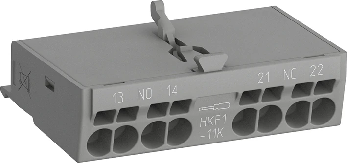 Hulpcontacten HKF1-K met Push-in Spring-klemmen veranderen van stand samen met de hoofdcontacten van de motorbeveiligingsschakelaar. Ze worden aan de voorzijde gemonteerd op de motorbeveiligingsschakelaars MS116, MS132 of MS165. Hulpcontacten HKF1-K zijn beschikbaar als normaal open (NO) of normaal gesloten (NC) en zorgen voor een snelle en eenvoudige bedrading zonder gereedschap dankzij de innovatieve Push-in Spring-technologie. |