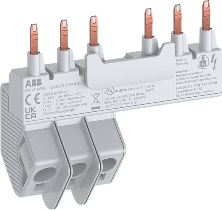 PS1-2-1-65K 3-fase verzamelrail maakt een eenvoudige en snelle parallelschakeling mogelijk van 2x MS132-K handmatige motorstarters plus 1 zijdelings hulpcontact, zonder gereedschap: de rail wordt simpelweg in de klemmen gedrukt. Het voedingsblok is in de verzamelrail geïntegreerd, wat de logistiek en planning optimaliseert door het aantal benodigde onderdelen te verminderen. De nominale stroom is 65 A. PS1-K-verzamelrails zijn gecertificeerd voor UL Type E- en Type F-toepassingen. |