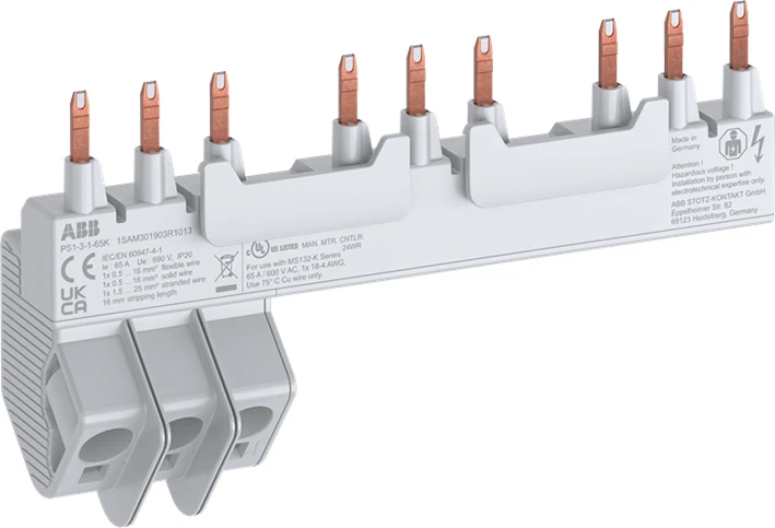 De PS1-3-1-65K 3-fase kamrail maakt een eenvoudige en snelle parallelle aansluiting mogelijk van 3x MS132-K handbediende motorstarters + 1 lateraal hulpcontact, zonder gereedschap: de kamrail wordt simpelweg in de klemmen gedrukt. Het voedingsblok is in de kamrail geïntegreerd, wat logistiek en planning optimaliseert doordat er minder onderdelen nodig zijn. De nominale stroom is 65 A. PS1-K kamrails zijn gecertificeerd voor UL Type E- en Type F-toepassingen. |