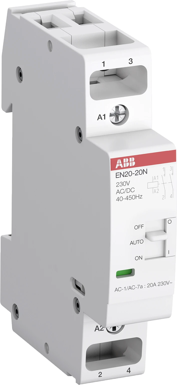 De EN20..N-installatiecontactors worden gebruikt voor het schakelen van enkelvoudige belastingen tot 20 A en kunnen worden bediend met AC of DC en/of handmatig. Deze contactors zijn geschikt voor toepassingen in de woningbouw en in industriële omgevingen. Ze bieden de volgende voordelen: bromvrije werking, laag energieverbruik, geïntegreerde overspanningsbeveiliging en handmatige overbrugging. Er zijn diverse contactcombinaties en accessoires beschikbaar. Handbediening is beschikbaar in 3 standen: Aan, Uit, Auto. |