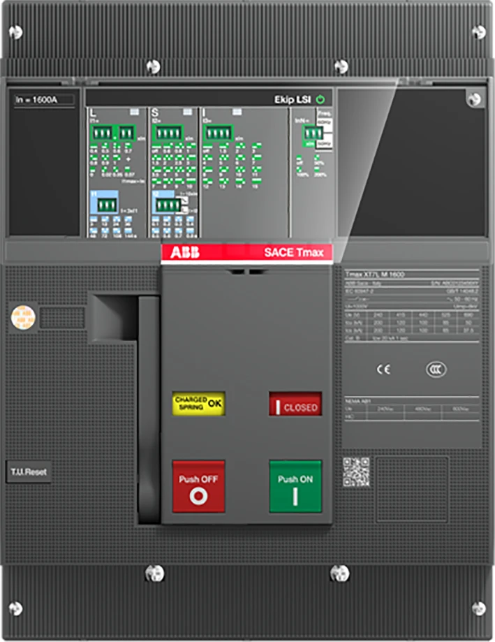 Vermogensautomaat TMAX XT7L 800, vast, driepolig, met vooraansluitingen, met opgeslagen-energie bedieningsmechanisme en hendelbediening, en met elektronische beveiliging in AC Ekip Dip LSIG R 800. |
