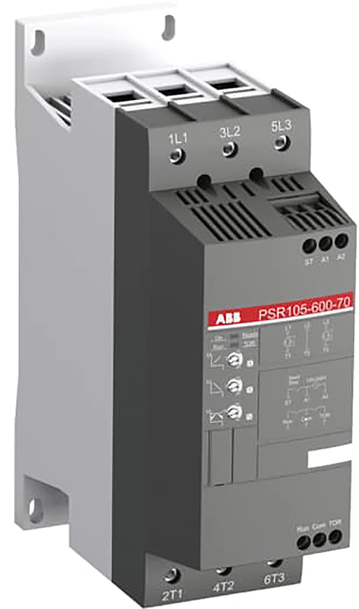 De softstarter PSR105-600-70 heeft een nominale maximale bedrijfsstroom van 105 A en een bedrijfsspanningsbereik van 208...600 V AC. De nominale stuurspanning ligt tussen 100...240 V AC bij 50/60 Hz. PSR biedt tweefasenregeling met softstart en -stop via een spanningsramp. Het apparaat heeft een ingebouwde bypass voor eenvoudige installatie en energiebesparing. Een RUN- en TOR-signaal zijn beschikbaar via een relaisuitgang in NO (normally open). De start/stop-ramp en -tijd zijn eenvoudig in te stellen met drie potentiometers aan de voorzijde. PSR wordt vaak gebruikt in combinatie met een handmatige motorstarter (MMS) van ABB; daarvoor zijn mechanische aansluitsets beschikbaar. Een andere populaire optie is Fieldbus-communicatie, die kan worden ingeschakeld met een externe adapter en een Fieldbus-plug. De PSR-serie is onze meest compacte reeks softstarters met basisfunctionaliteit en -waarden. Ze zijn geschikt voor kleine driefasenmotoren met nominale stromen van 3...105 A en kunnen tot 100 starts per uur aan. Veelgebruikte toepassingen zijn bijvoorbeeld pompen, ventilatoren, compressoren en transportbanden. |