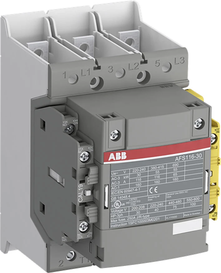 De AFS116-30-12B-12 is een 3-polige contactor voor 690 V IEC of 600 V UL, met vooraf gemonteerde zijkant-hulpcontactblokken: links 1 (1 NO + 1 NC) en rechts vast 1 (1 NC), met hoofstroom-railaansluitingen. Hij stuurt motoren tot 55 kW / 400 V AC (AC-3) of 75 hp / 480 V UL en schakelt vermogenskringen tot 160 A (AC-1) of 160 A UL general use. AFS-contactoren zijn eenvoudig te integreren in systemen van machinebouwers conform de hoofdnormen EN ISO 13849 en EN 62061 – wat het veilige gebruik van machines en apparatuur ondersteunt. Een goed herkenbaar geel low-energy hulpcontactblok zorgt voor de status-terugkoppelingscircuits die vereist zijn in machineveiligheidstoepassingen. Dankzij AF‑technologie heeft de contactor een brede stuurspanningsrange (48–130 V 50/60 Hz en DC), waardoor grote variaties in stuurspanning worden opgevangen, het energieverbruik in de besturingskast afneemt en eenduidige werking bij instabiele netten wordt geborgd. Bovendien is overspanningsbeveiliging ingebouwd voor een compacte oplossing. AF-contactoren hebben een bloktype-ontwerp, zijn eenvoudig uit te breiden met opsteekbare hulpcontactblokken en een brede reeks accessoires. |