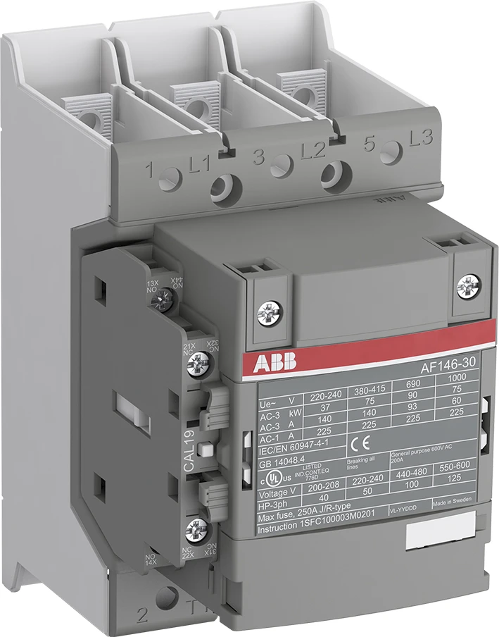 De AF146-30-11B-14 is een 3-polige contactor – 1000 V IEC of 600 V UL – met voorgemonteerde hulpcontacten en hoofdstroomrails, voor het aansturen van motoren tot 75 kW / 400 V AC (AC-3) of 100 hp / 480 V UL en het schakelen van vermogenscircuits tot 225 A (AC-1) of 200 A UL algemeen gebruik. Dankzij de AF-technologie heeft de contactor een brede stuurspanningsrange (250–500 V 50/60 Hz en DC), vangt hij grote variaties in stuurspanning op, verlaagt hij het energieverbruik in de kast en zorgt hij voor betrouwbare werking in instabiele netwerken. Bovendien is overspanningsbeveiliging geïntegreerd, wat een compacte oplossing biedt. AF-contactors hebben een blokontwerp en zijn eenvoudig uit te breiden met hulpcontactblokken en een breed scala aan accessoires. |