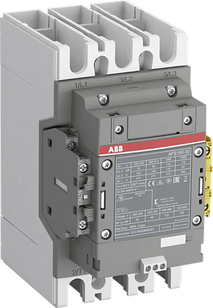 De AFS190-30-12-33 is een 3-polige contactor voor 1000 V IEC of 600 V UL, met voorgemonteerde zij-hulpcontactblokken: links 1 (1 N.O. + 1 N.C.) en rechts vast 1 (1 N.C.), met Main Circuit Bars-aansluitingen. Hij stuurt motoren tot 90 kW / 400 V AC (AC-3) of 125 hp / 480 V UL en schakelt vermogenscircuits tot 275 A (AC-1) of 250 A UL general use. AFS-contactors zijn eenvoudig te integreren in systemen van machinebouwers die voldoen aan de normen EN ISO 13849 en EN 62061, wat het veilige gebruik van machines en apparatuur waarborgt. Een goed herkenbaar geel laag-energie hulpcontactblok zorgt voor de status-terugmeldcircuits die vereist zijn in machineveiligheidstoepassingen. Dankzij de AF-technologie heeft de contactor een brede stuurspanningsrange (100–250 V 50/60 Hz en DC), beheert grote variaties in stuurspanning, verlaagt het energieverbruik van de besturingskast en zorgt voor duidelijke werking in instabiele netwerken. Bovendien is overspanningsbeveiliging ingebouwd voor een compacte oplossing. AF-contactors hebben een blokontwerp en zijn eenvoudig uit te breiden met opzet-hulpcontactblokken en een breed assortiment accessoires. |