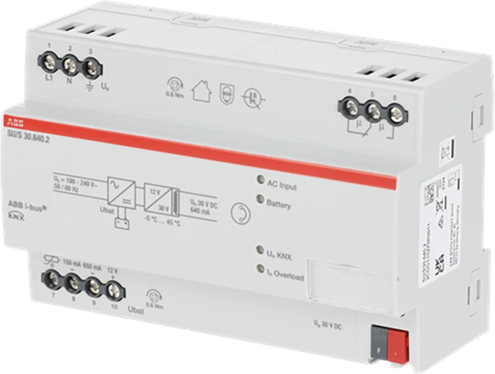 Ononderbroken voeding 640 mA met geïntegreerde smoorspoel voor de voeding van een ABB i-bus® KNX-buslijn, kortsluit- en overbelastingsbestendig. LED's voor weergave van de status van de busstroom, netspanning en accuspanning. Groot ingangsbereik van 85…265 V AC, 50/60 Hz. De voeding kan bij normaal gebruik de accumodule AM/S 12.1 of maximaal 2 accu's opladen. Bij uitval van de netspanning wordt de busspanning via de batterijen geleverd. |