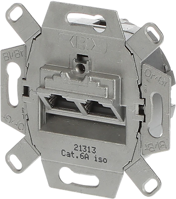 Inbouwsokkel voor datacommunicatie. 2x RJ45, cat. 6A iso, afgeschermd, 2 connectoren, 8/8-polig. Met schuine uitvoer en LSA-snijklemmen. RJ45-aansluitingen voor netwerken volgens cat. 6A, Class EA (10 Gbit/s / 500 MHz). |
