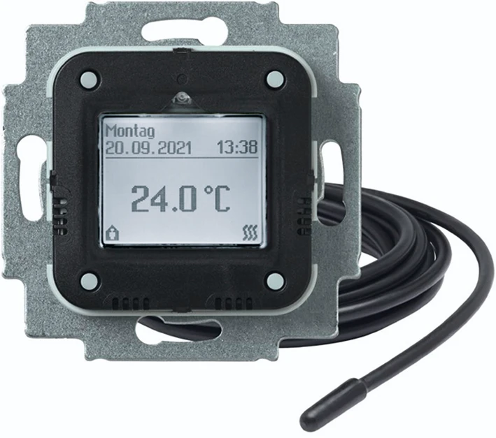 Inbouw electronische ruimtetemperatuurregelaar met timer, maakcontact, verlichtbare lcd voor indicatie werkelijke waarde, externe voeler, klasse temperatuurregelaar IV, 16 A, 230 V AC. |