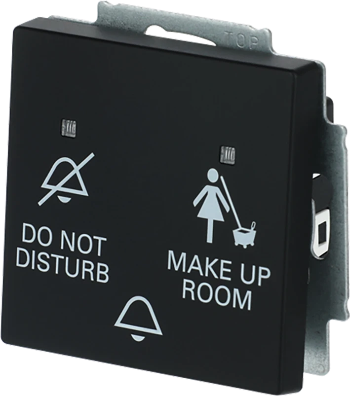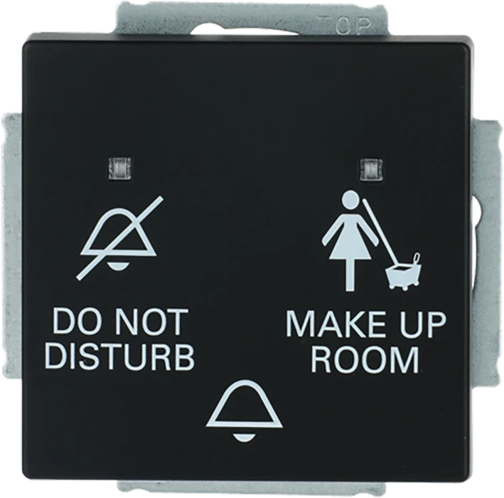 Inbouw wip-impulsdrukkersokkel, 1-polig, maakcontact (NO), 10 A, 230 V AC., met bedieningswip, met belopdruk, met DO NOT DISTURB en MAKE UP ROOM opdruk, met LED-indicatie, f-matzwart. |