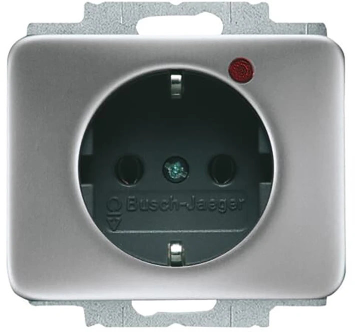 Inbouw Busch-Protector® wandcontactdoos met randaarde, met overspanningsbeveiliging, met geïntegreerde LED en extern meldcontact, a-titanium. |