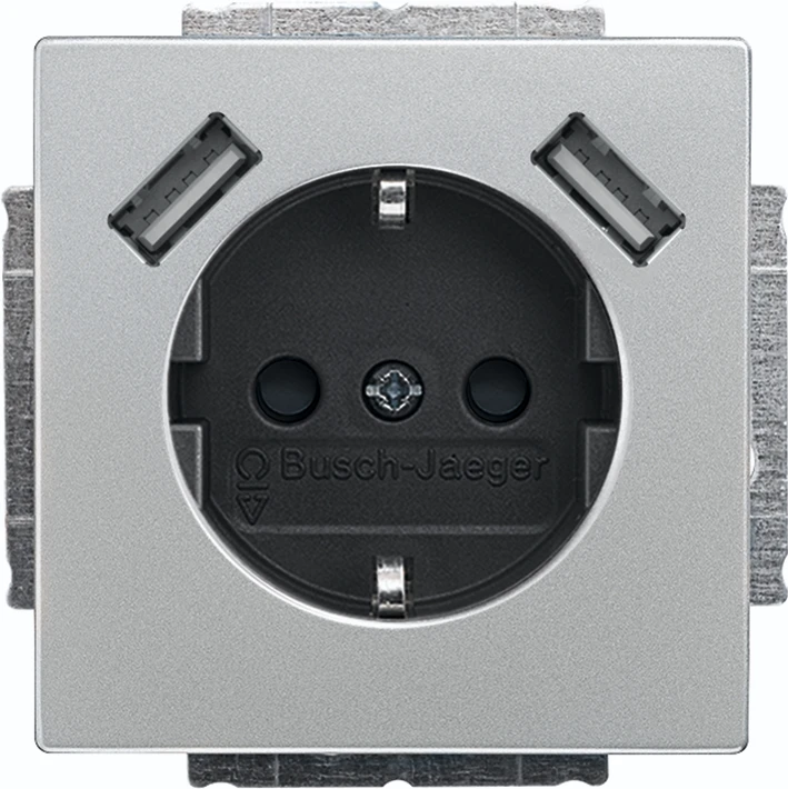 Inbouw wandcontactdoos met randaarde, met verhoogde aanraakbeveiliging, met 2x USB-A voeding, pure-rvs |