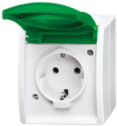 Opbouw wandcontactdoos met randaarde, met groene klapdeksel, met opdruk "SV", met 57,8 x 9,8 mm tekstveld, IP44, ocean-alpinwit. |