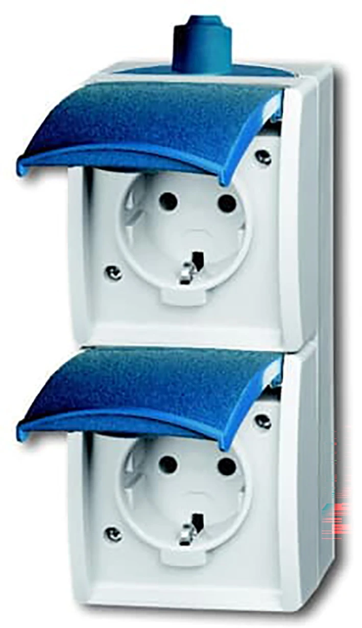 Opbouw wandcontactdoos met randaarde, 2-voudig, voor verticale montage, met klapdeksel, IP44, ocean. |