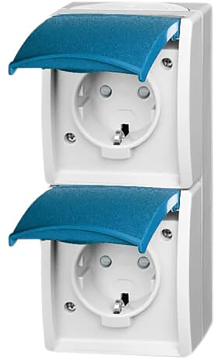 Opbouw wandcontactdoos met randaarde, met verhoogde aanraakbeveiliging, 2-voudig, voor verticale montage, met klapdeksel, IP44, ocean. |