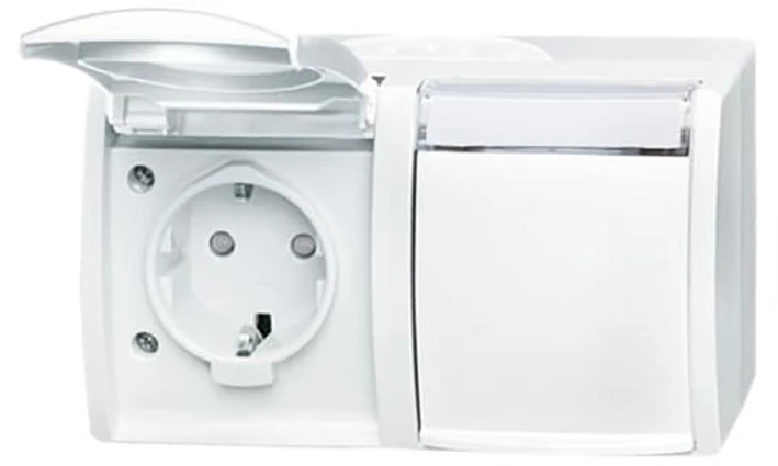 Opbouw wandcontactdoos met randaarde, met verhoogde aanraakbeveiliging, 2-voudig, voor horizontale montage, met klapdeksel, IP44, ocean-alpinwit. |