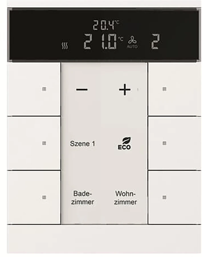 KNX Busch Tenton® ruimtetemperatuurregelaaar, met 6-voudig bedieningselement, met busaankoppelaar, met tekstveld, studiowit. |
