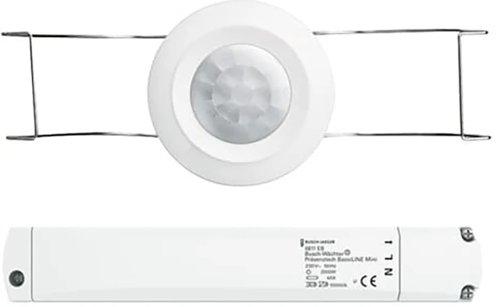 Busch-Wächter® Present tech BasicLINE mini, voor het helderheids- en bewegingsafhankelijk schakelen van verlichting, 4 A, 230 V AC, plafondinbouwmontage door middel van geïntegreerde veerbeugels. |